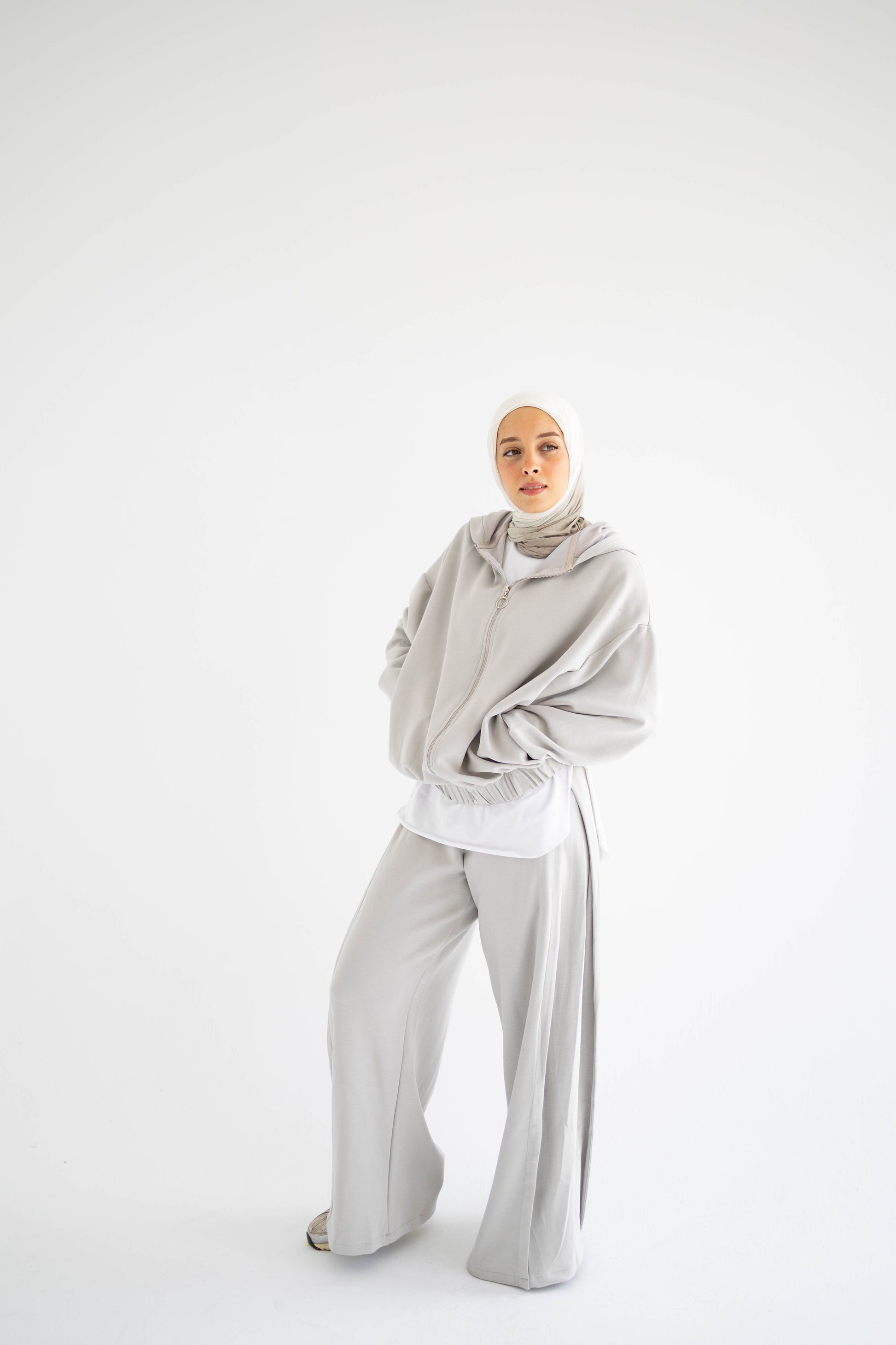- Comfy fit with wide-leg pants.