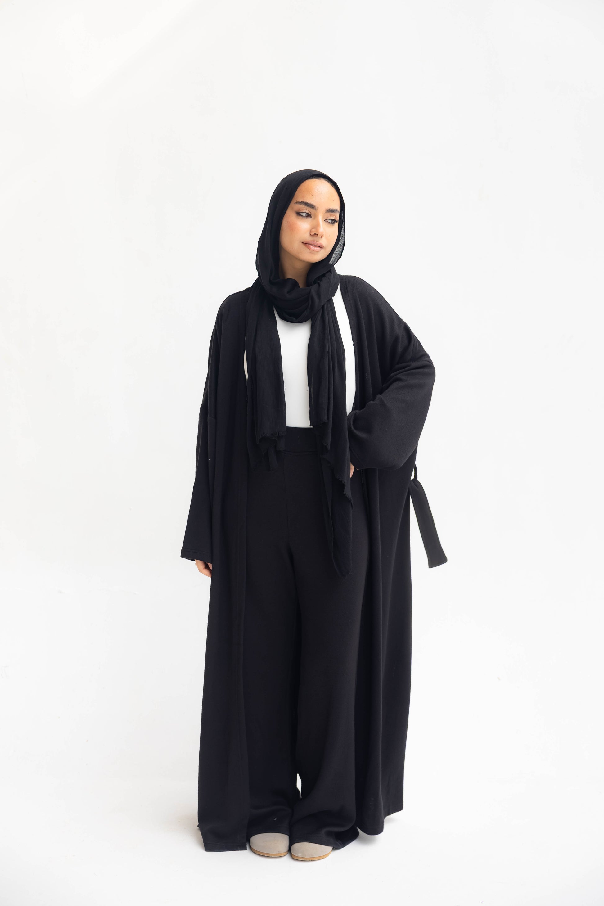-Knit Long Cardigan: This cozy cardigan features an open front design and gentle flow, making it perfect for layering. The long length adds elegance and warmth, while the versatile black color complements any outfit.